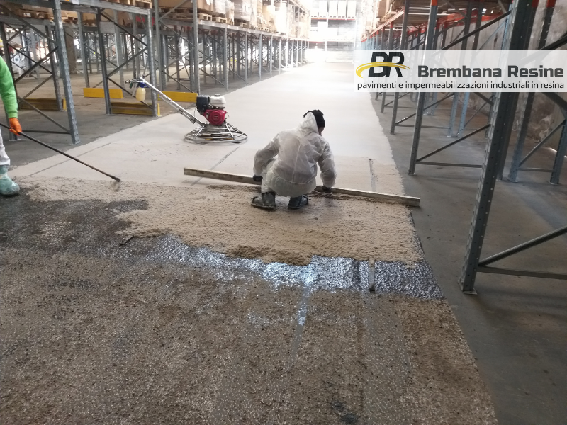Successivamente avviene la compattazione grazie all’utilizzo di macchine frattazzatrici e la saturazione con resine epossidiche pigmentate. Al termine di queste operazioni è possibile procedere con la posa di una finitura antisdrucciolo e di eventuali linee segnaletiche.